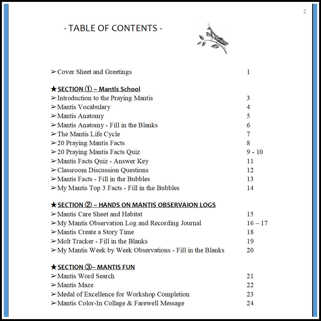 The 24 page workshop and observation lab included with this kit is a complete praying mantis information lesson and hands-on experience teaching students all about this insect. As you can see by the table of contents, there are extensive observation logs and journals, a variety of interactive activities, quizzes, diagrams, a vocabulary sheet, mantis care sheet, creative games and a printable "medal of excellence" upon completion.