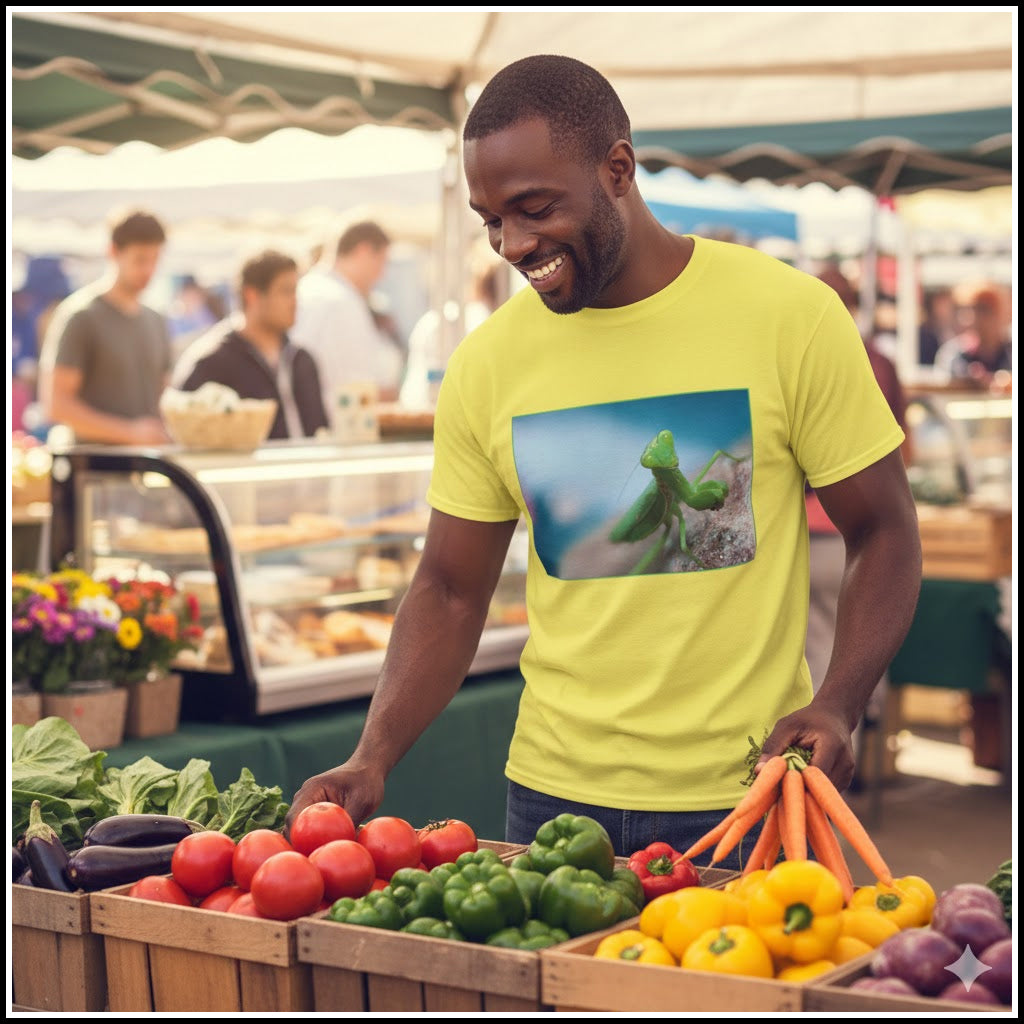 Wear your love for nature on your sleeve with this vibrant Blue Planet tee that turns heads while celebrating our home and its animal life.. Our men's praying mantis t-shirts will make a chic addition to your wardrobe. Everyone loves a beautiful mantis and a high quality, comfy tee. Why not put the two together?