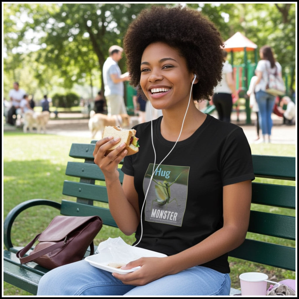 Wear your love of snuggles on your sleeve with this playful Hug Monster tee that declares you're a certified cuddle enthusiast. Perfect for anyone who believes the best hugs come with a side of monster-sized affection. Our classic women's T-shirts are a timeless and fashionable wardrobe staple. And with these elegant and beautiful praying mantis designs, you will make an alluring and chic statement.